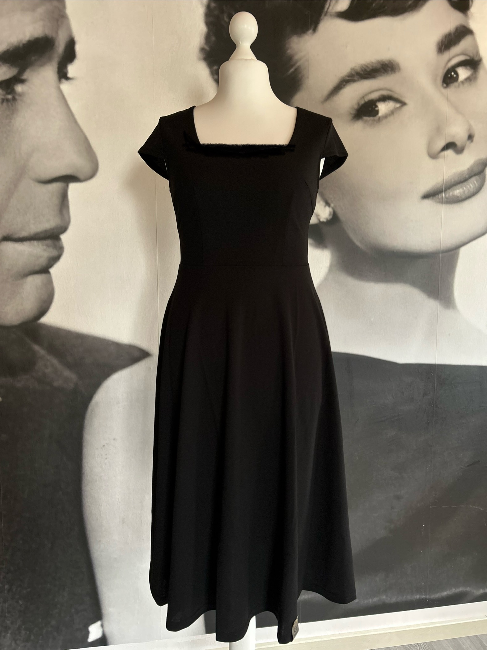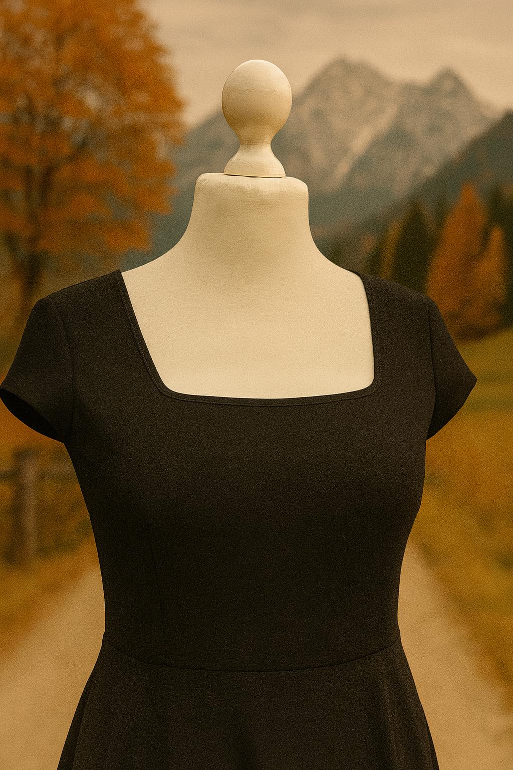 Elegantes Dirndl mit Karree-Ausschnitt, überschnittener Schulter und hoch angesetzter Taille, gefertigt aus Baumwolle, Elasthan und Sojafasern, waschbar bei 30 bis 40 Grad, gefertigt in Maria Alm.