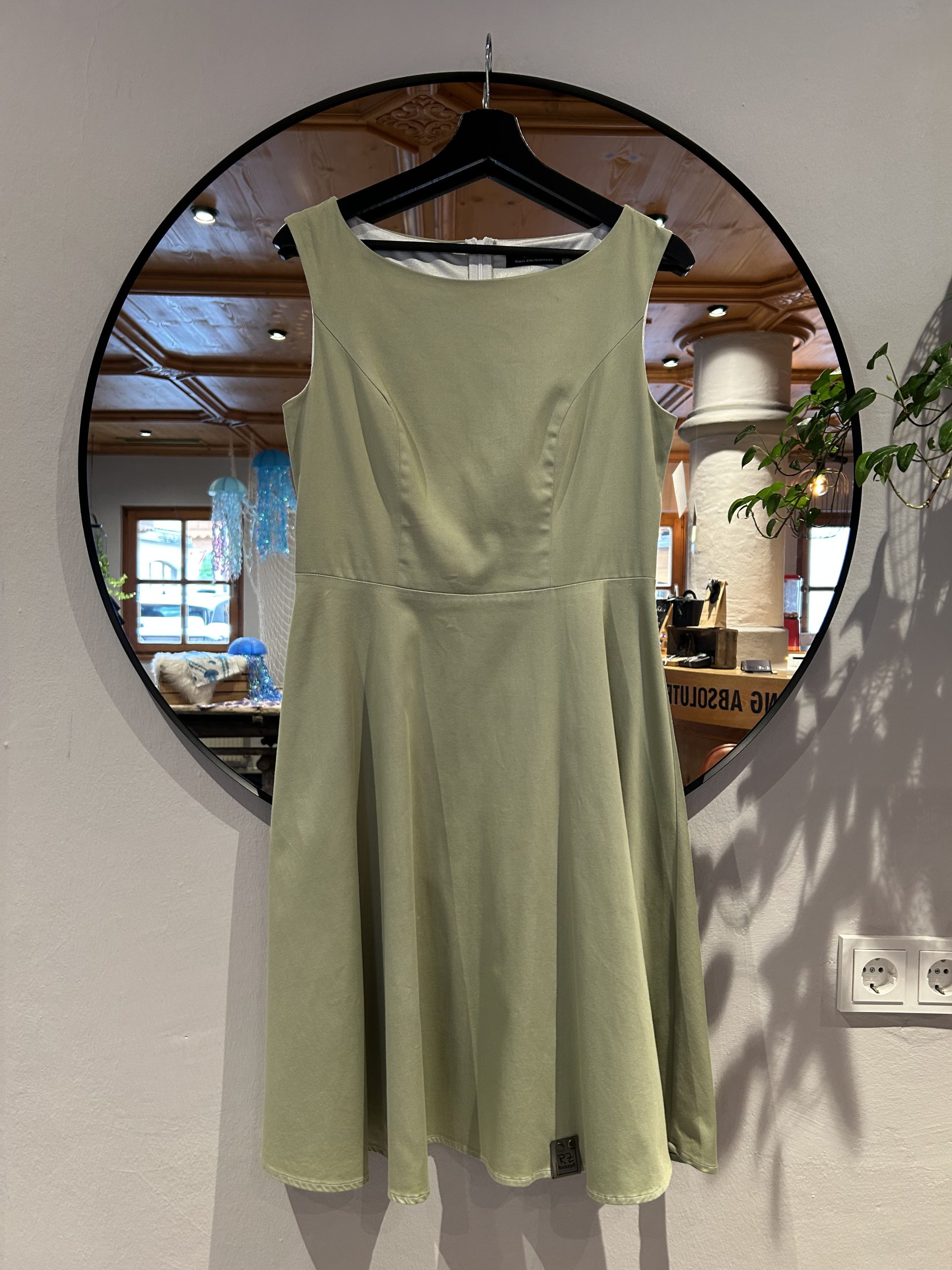 Klassisches Kleid in Salbei, Größe 38, als letztes Einzelstück sofort verfügbar, gefertigt aus Baumwolle mit Elasthan, Rocklänge 59 cm, liebevoll entworfen im Atelier in Maria Alm.